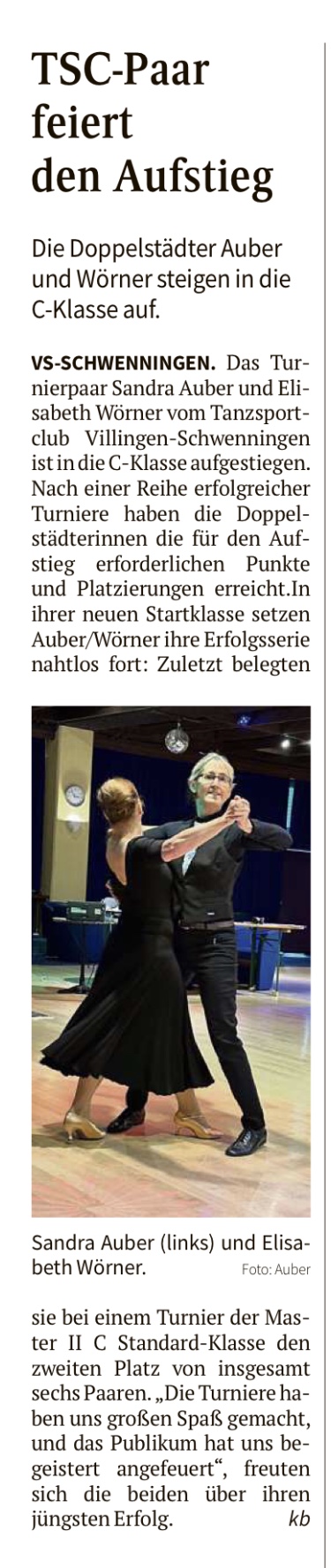 (Siehe auch Schwarzwälder-Bote) Am Samstag veranstaltet der TSC Villingen-Schwenningen – in Zusammenarbeit mit der Tanzsportschule Seidel – sein großes Frühjahrsevent. Die Erfolgsbilanz der Standard-Tanzpaare des TSC beim eigenen Pokalturnier konnte sich sehen lassen. Fünf Paare der Doppelstädter waren am Start – und alle erreichten die Finalrunde. Am Ende sprangen die Plätze eins bis vier heraus. Schon zu Beginn des Turniertages schafften es zwei TSC-Paare in der Turnierklasse Senioren II D auf das Treppchen. Dieter Ruppert und Irina Sajkovic belegten den ersten Platz. Dadurch durfte das VS-Paar auch in der höheren Turnierklasse Senioren II C teilnehmen. Der zweite Platz ging an Joachim Koßmann/Andrea Koßmann vom TSC. In der Turnierklasse Senioren II C erreichten zwei weitere TSC-Paare – nach einer spannenden Vorrunde – das Finale. Achim Specker und Silvia Neu überzeugten in diesem mit einem guten dritten Rang. Dieter Ruppert und Irina Sajkovic nutzten ebenfalls ihre Möglichkeiten. Sie belegten den vierten Platz. In der Turnierklasse Senioren III B überzeugten Michael Probst/Helga Fischer mit dem zweiten Rang. Schließlich erreichten Michael Enz und Karin Schreiner in der höchsten Turnierklasse – Senioren III S – den vierten Platz. Hier waren sechs Paare am Start. Turnier des TSC Villingen-Schwenningen Senioren II D Standard: 1. Dieter Ruppert/Irina Sajkovic, 2. Joachim und Andrea Koßmann (beide TSC Villingen-Schwenningen). Senioren II C Standard: 1. Harald und Maria Dehner (Augsburg), ... 3. Achim Specker/Silvia Neu, 4. Dieter Ruppert/Irina Sajkovic (beide TSC VS). Senioren II C Latein: 1. Marc Schmidt/Carina Nievergelt-Schmidt (Freiburg). Senioren III C Standard: 1.Werner und Maria Haug (Laupheim). Senioren III B Standard: 1.Salvatore und Sylvia Sarda (Rottweil), 2. Michael Probst/Helga Fischer (TSC VS) Senioren II B/A Latein: 1.Thomas und Christine Schönjahn (Achern). Senioren III A Standard: 1.Walter Ralle/Sabine Rechner-Ralle (Ludwigshafen). Senioren III S Standard: 1. Siegfried und Maria Klein (Stuttgart-Feuerbach), 2. Jürgen und Birgit Buttkus (Heidenheim), ... 4. Michael Enz/Karin Schreiner (VS). 14.04.2019 zurück zur Übersicht
